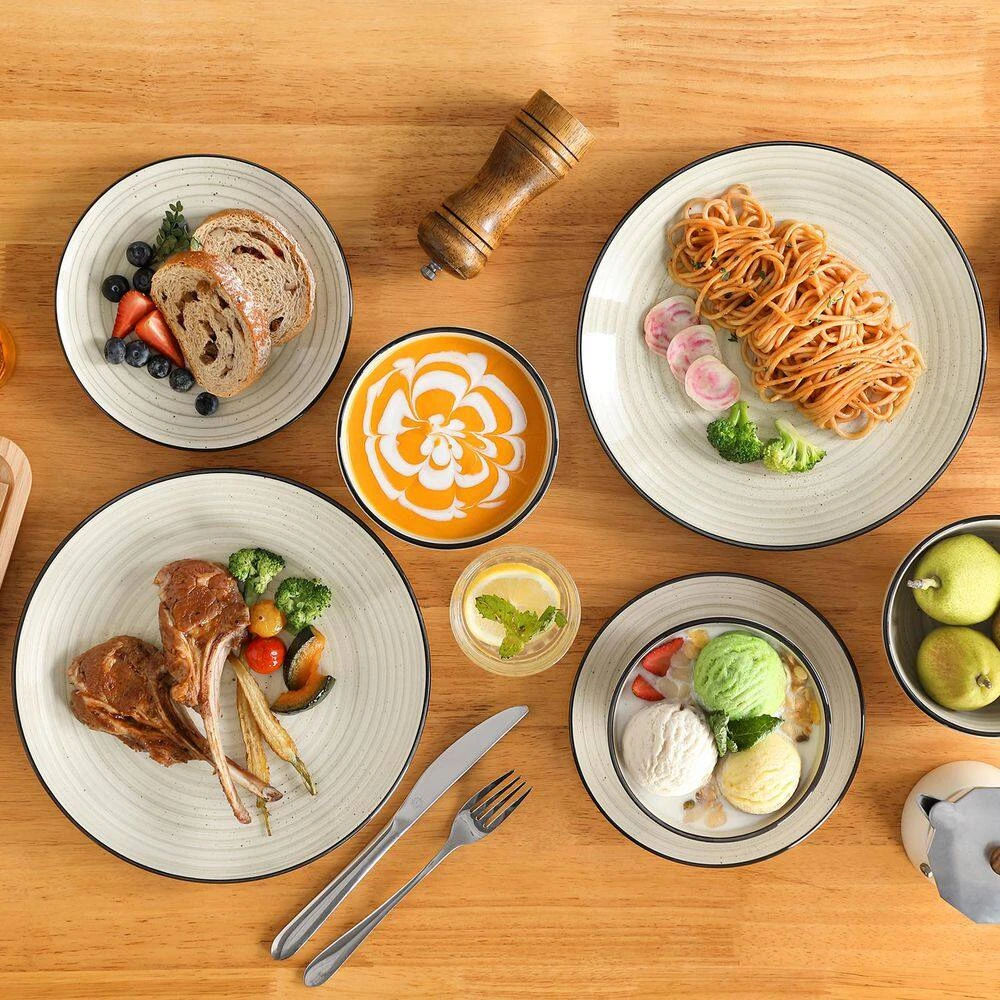 - The 12-piece bowls and plates dinner set includes 4 x 10.5 in. dinner plates, 4 x 7.5 in. dessert plates and 4 x 5.5 in. bowls (24 oz.). This tableware set perfect for salad, soup, deserts, appetizers & entrees