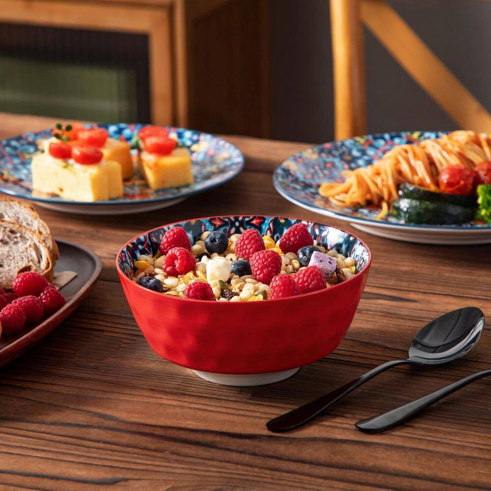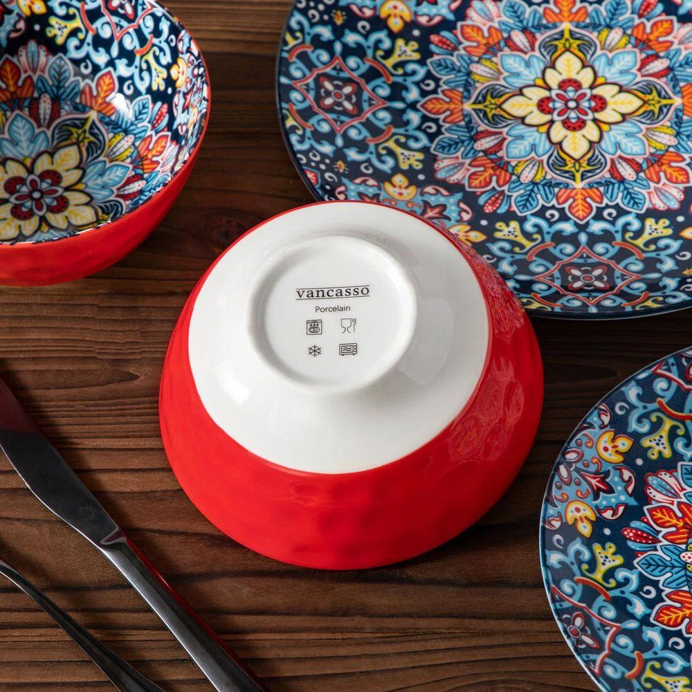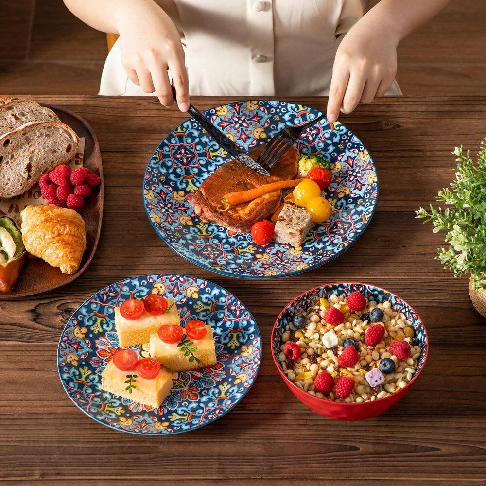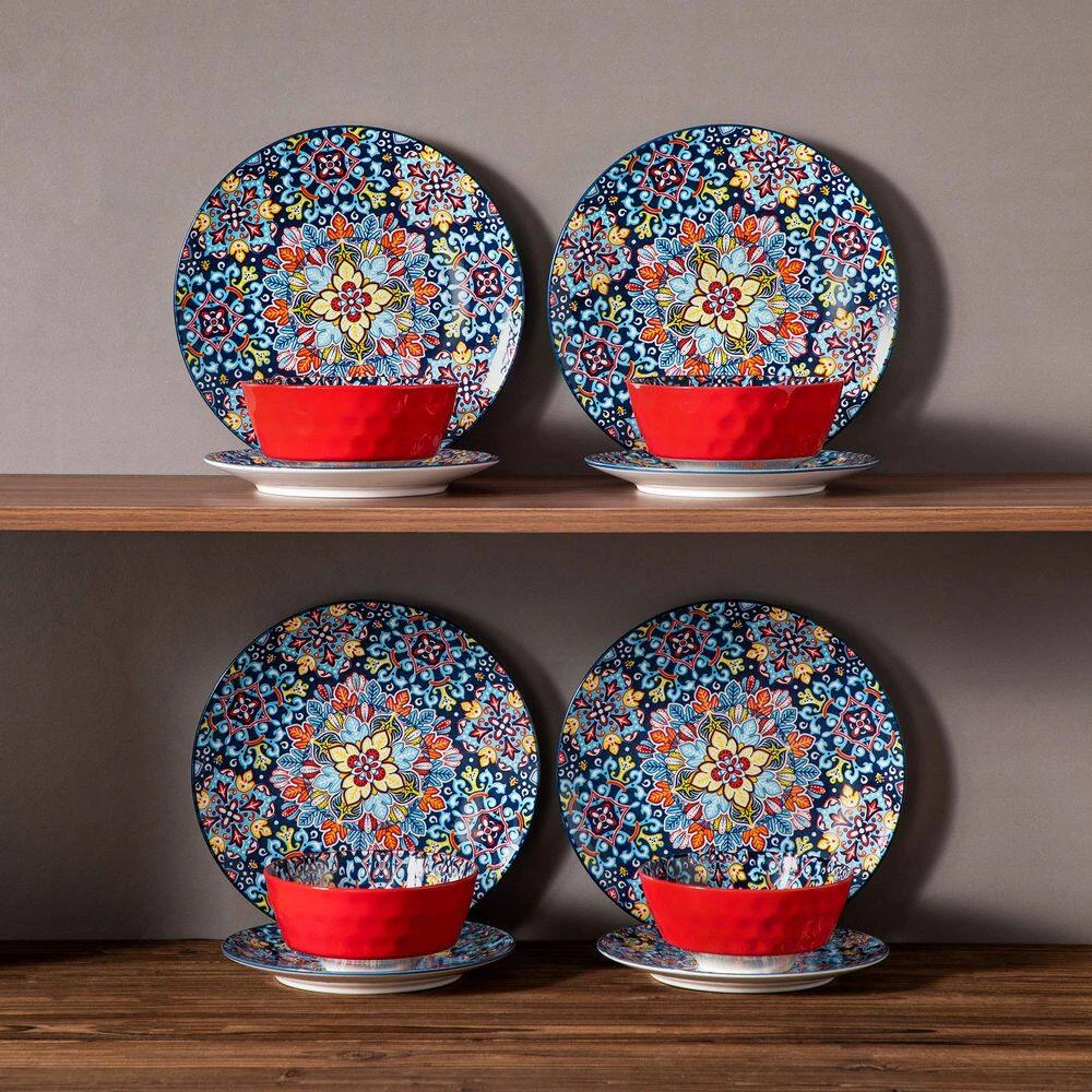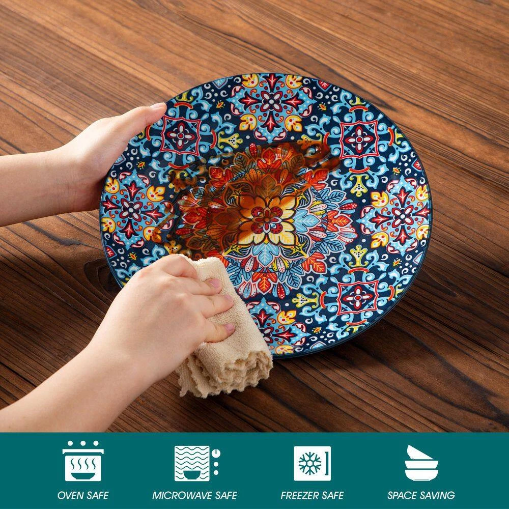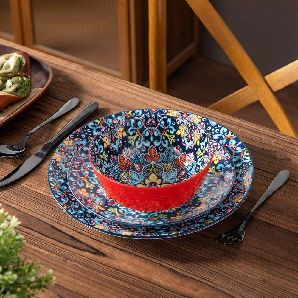 12-pieces Bohemian dinnerware set crafted from premium non-lead and non-cadmium porcelain, healthy and non-toxic. Evenly glazed with glossy finish, they make a beautiful, stylish impression and capture the free-spirited essence of Bohemian. Beyond using these dinnerware on your kitchen table, our bohemian plates, bowls serve as stunning pieces of decor. Hang them on the wall or display them on shelves to add an artistic and bohemian flair to your home, creating a captivating and inspiring atmosphere.