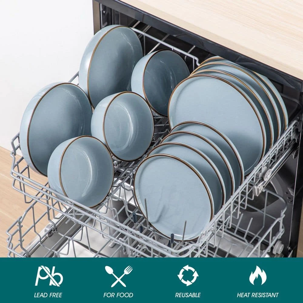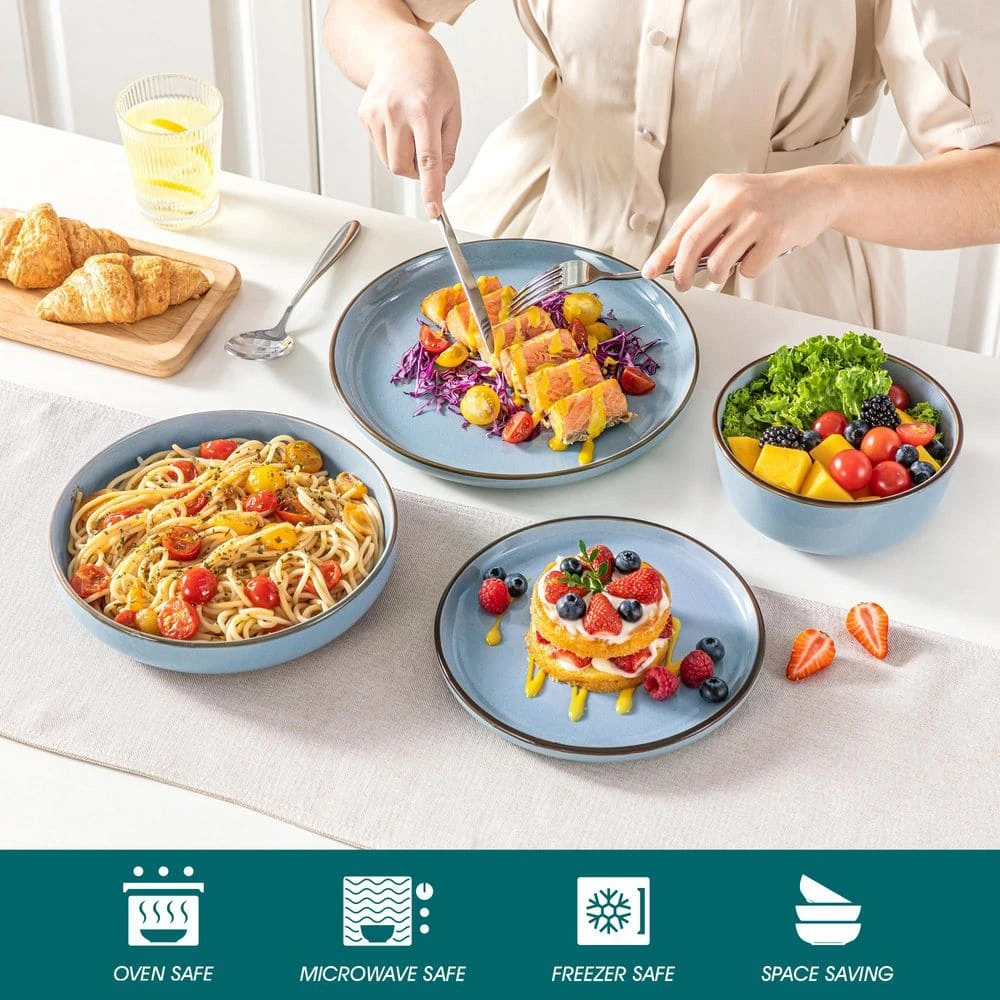 - Microwave-safe, oven-safe and dishwasher-safe stoneware plates and bowls set, engineered with stain-defying glaze, spills wipe off in seconds, spend less time scrubbing and more time enjoying meals with your loved ones, the stackable design saves cabinet space and can be used to place other tableware