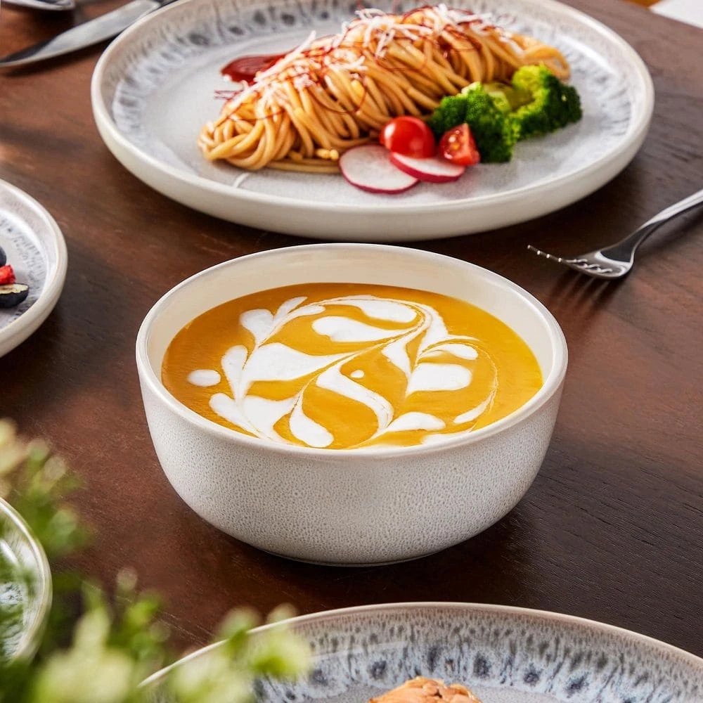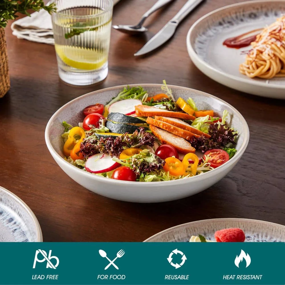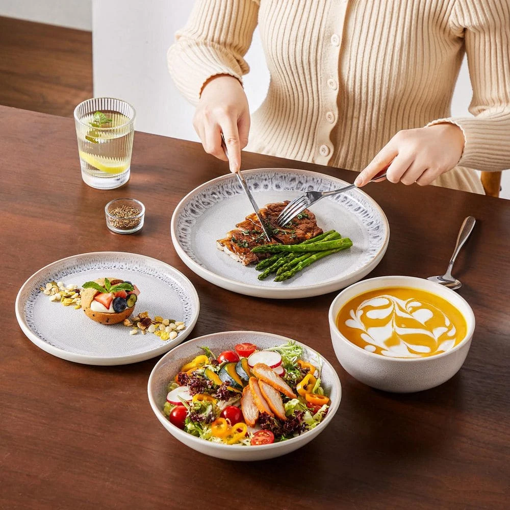 - Bowls and plates dinner set beautifully combines elegance and practicality, bring you ultimatily wonderful dinning experience each piece boasts a smooth surface that radiates a captivating shine, creating a warm and inviting atmosphere the unique snowflake speckle design adds a touch of charm and personality, making every meal feel special