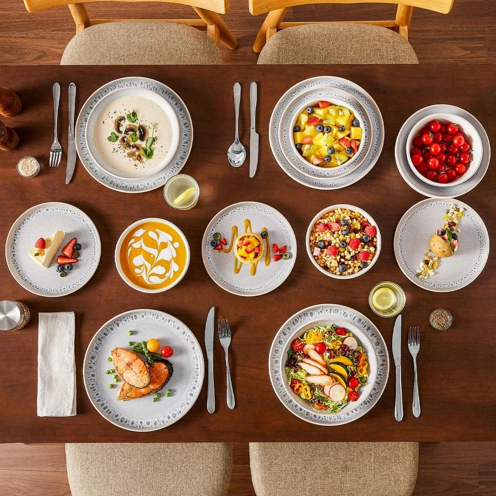 - 16-piece dinner set service for 4, includes 4-piece 10.25 in. dinner plates, 4-piece 8.25 in. salad plates, 4-piece pasta bowl and 4-piece 5.8 in. cereal bowls (24 oz.) this complete collection perfect for steak, salad, soup, rice, pasta, deserts, cereal, fruit, appetizers and entrees