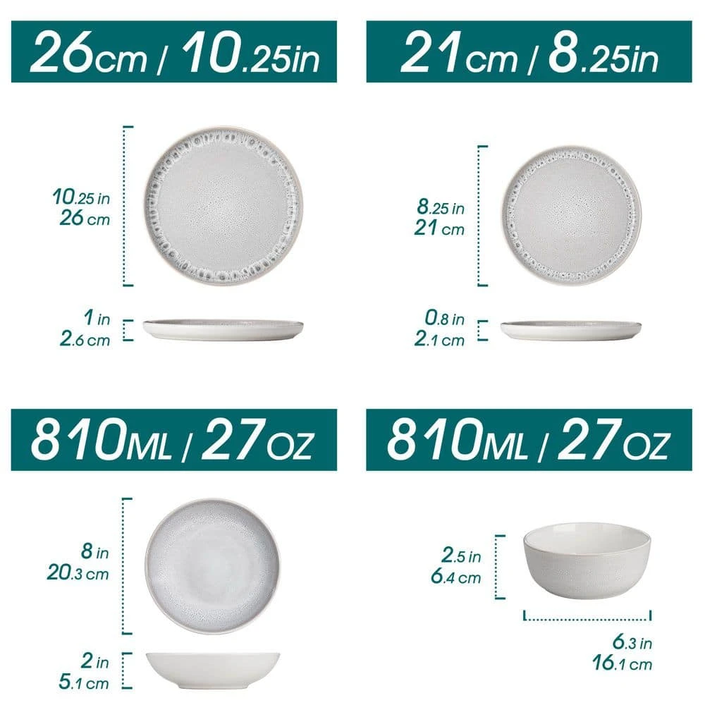 16-piece SNOW bowls and plates set crafted from stoneware material, non-lead and non-cadmium, non-toxic and harmless. Microwave safe, dishwasher safe, freezer safe and oven safe. Whether formal or casual events, this 4-place settings dinner service set (cream white outside, beige inside) will definite provide you a unforgatable dinning experience.