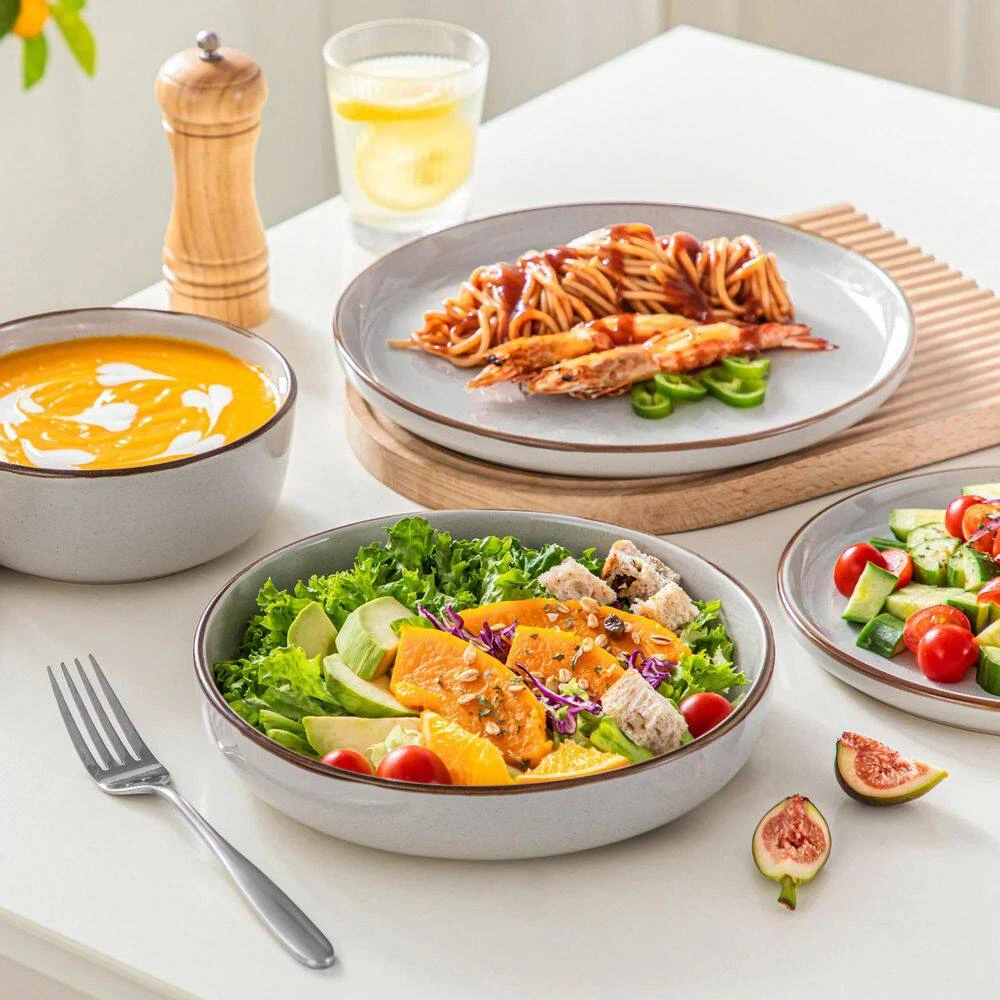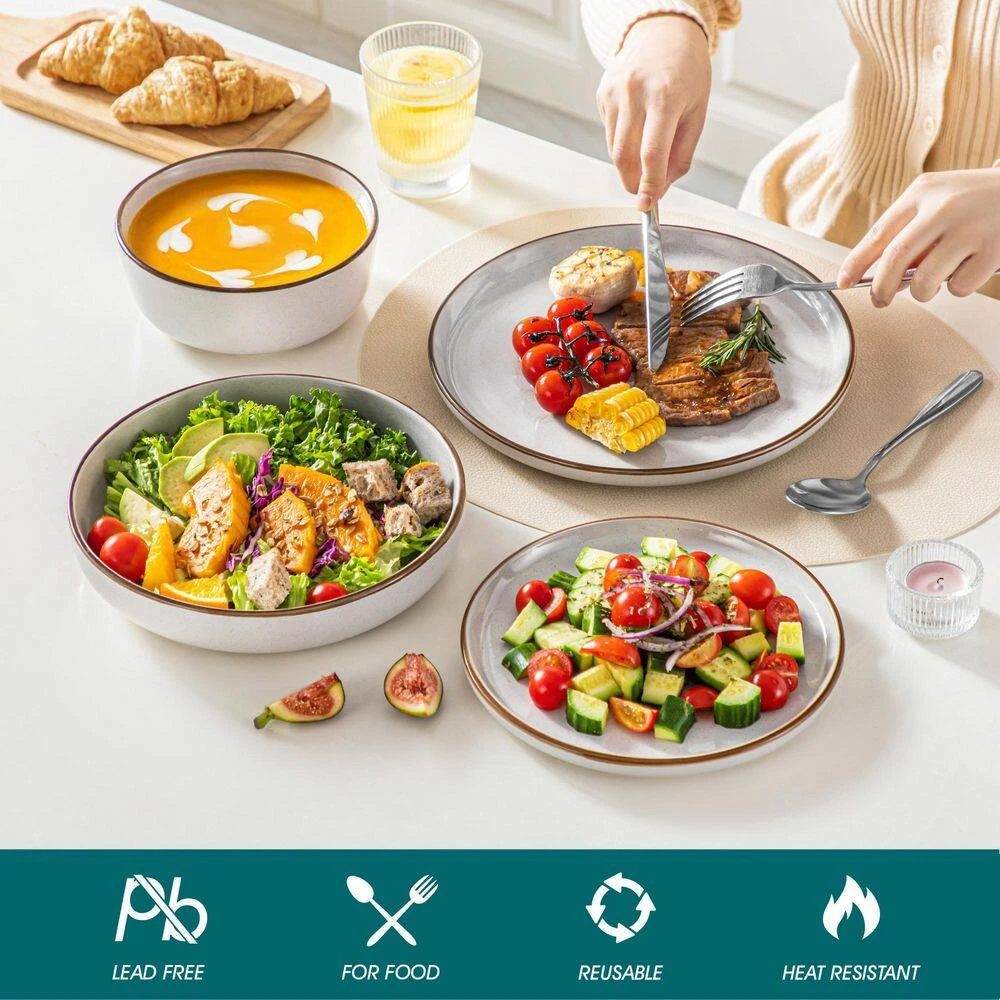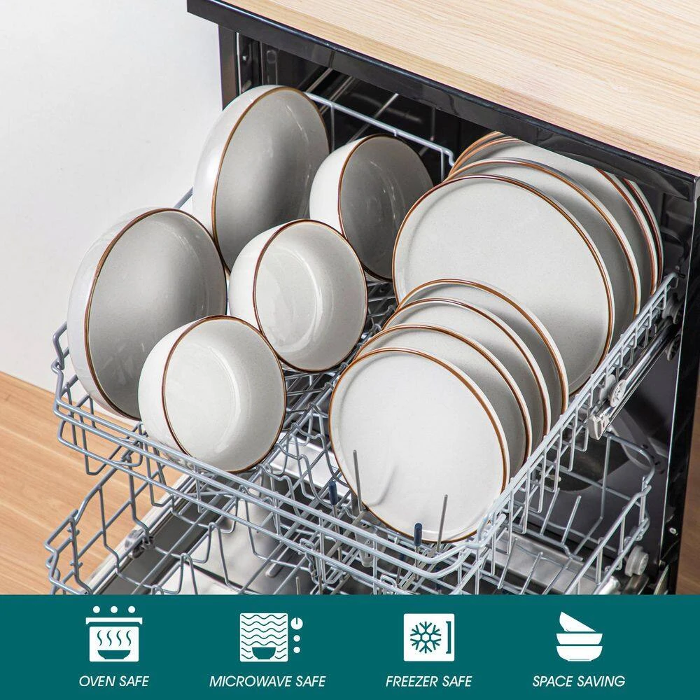- Microwave-safe, oven-safe and dishwasher-safe stoneware plates and bowls set, engineered with stain-defying glaze, spills wipe off in seconds, spend less time scrubbing and more time enjoying meals with your loved ones, the stackable design saves cabinet space and can be used to place other tableware