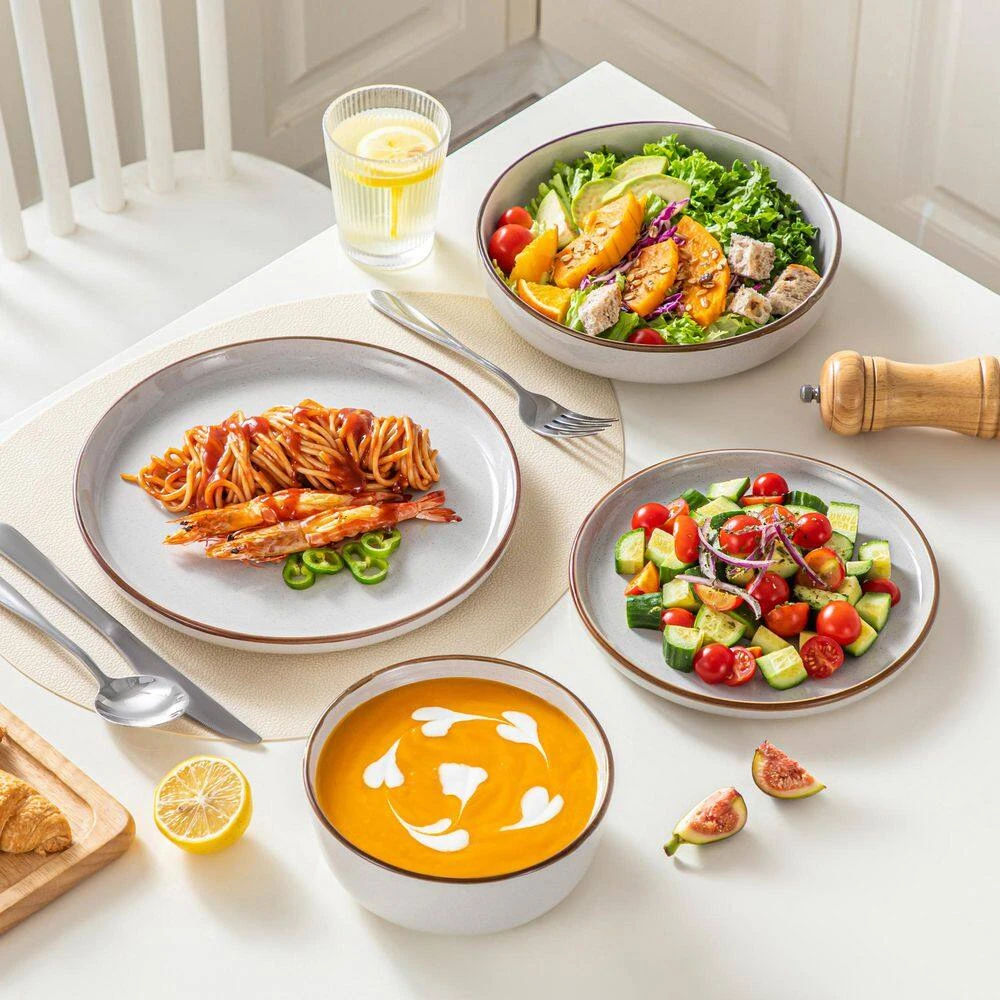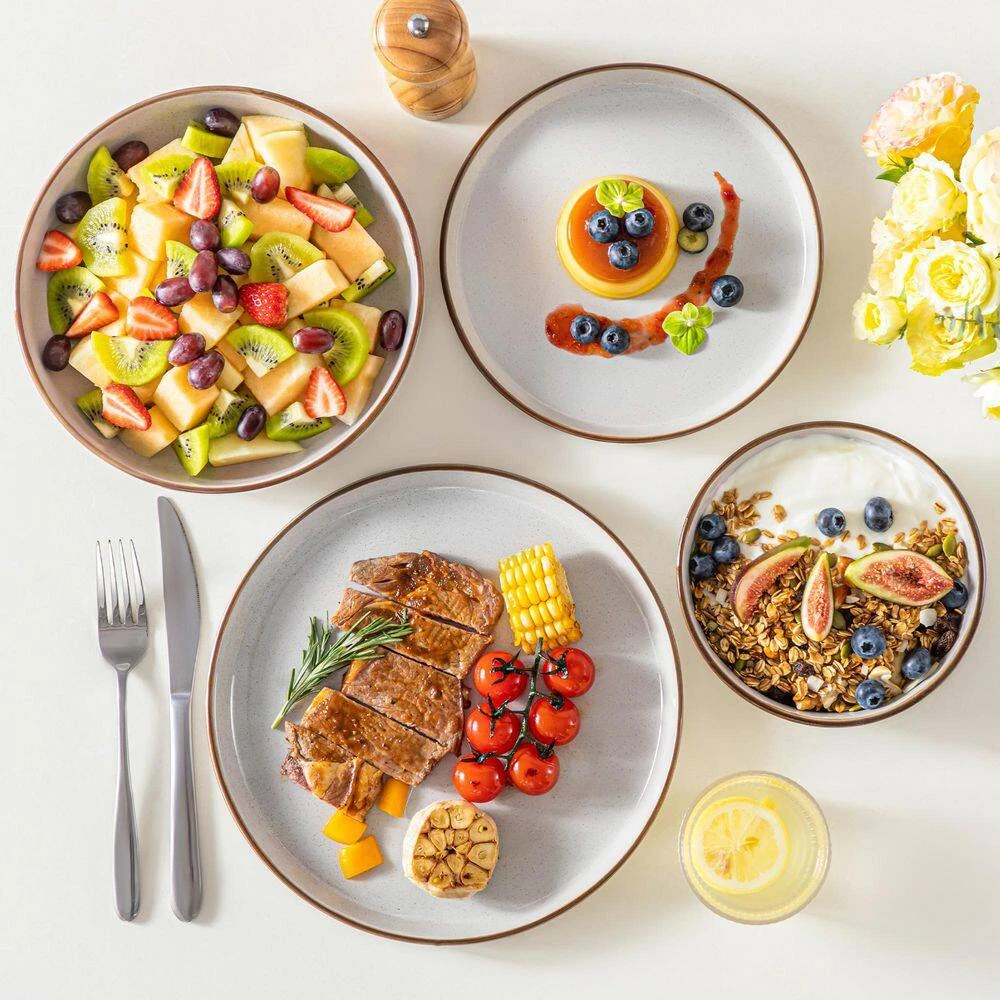Handcrafted stoneware bowls and plates dinner set. Elevate your table with this plates and bowls set featuring artisanal glaze, accented by sesame speckles and sophisticated brown trim, the brown rim of the bowls and plates makes this product more unique when compared to other flat tableware. Each piece doubles as a minimalist art decor to add more beautiful colours to your dining table.