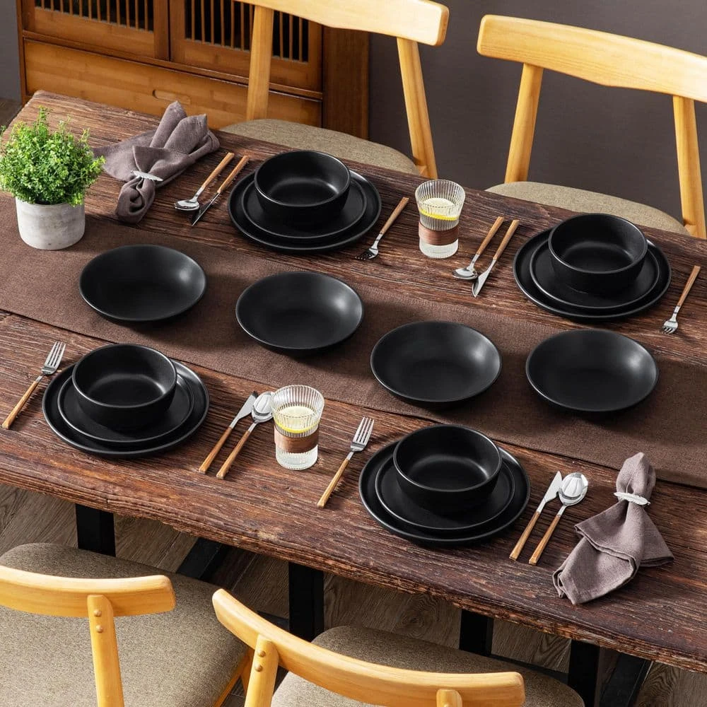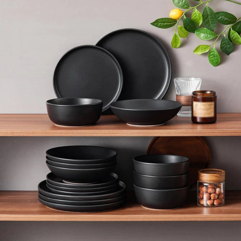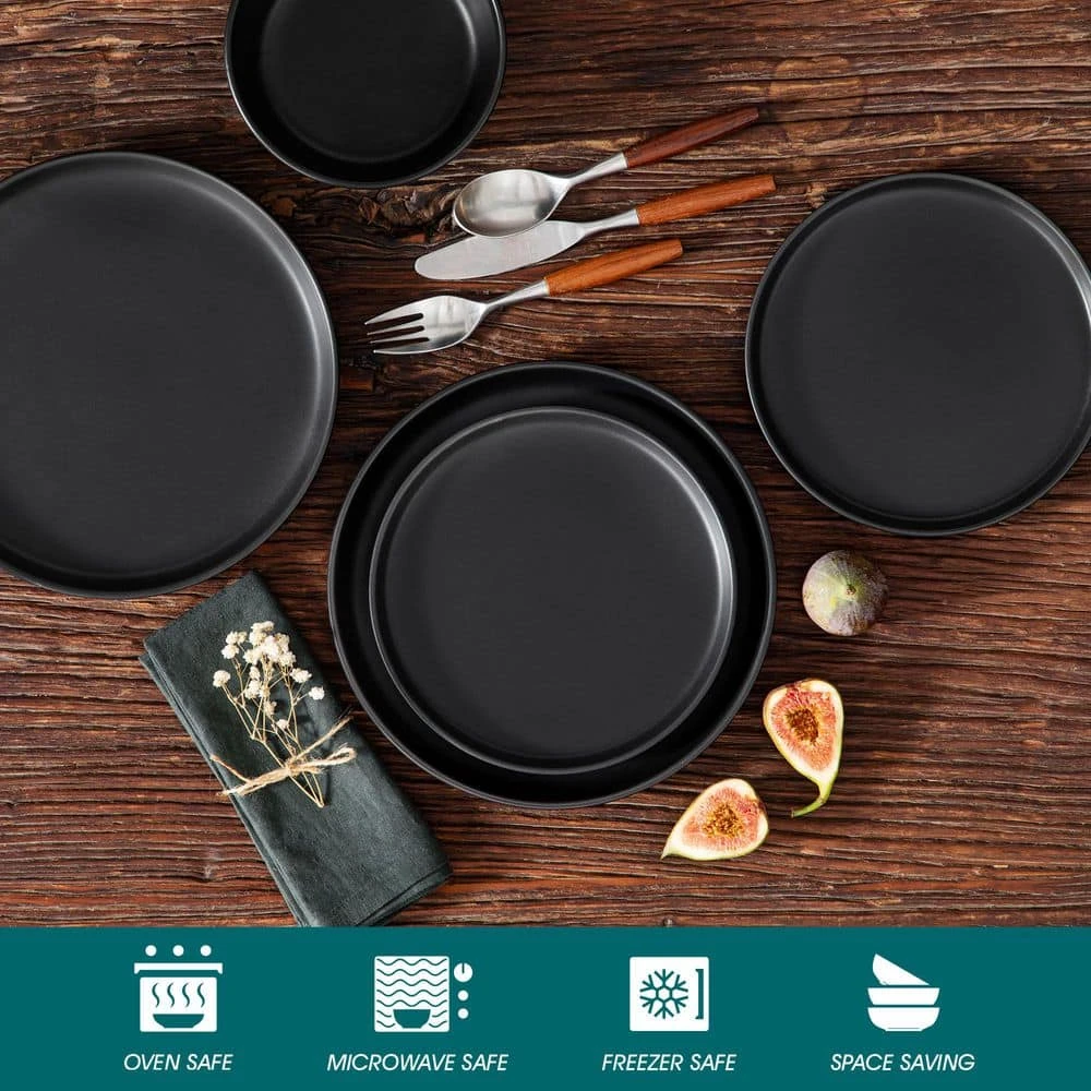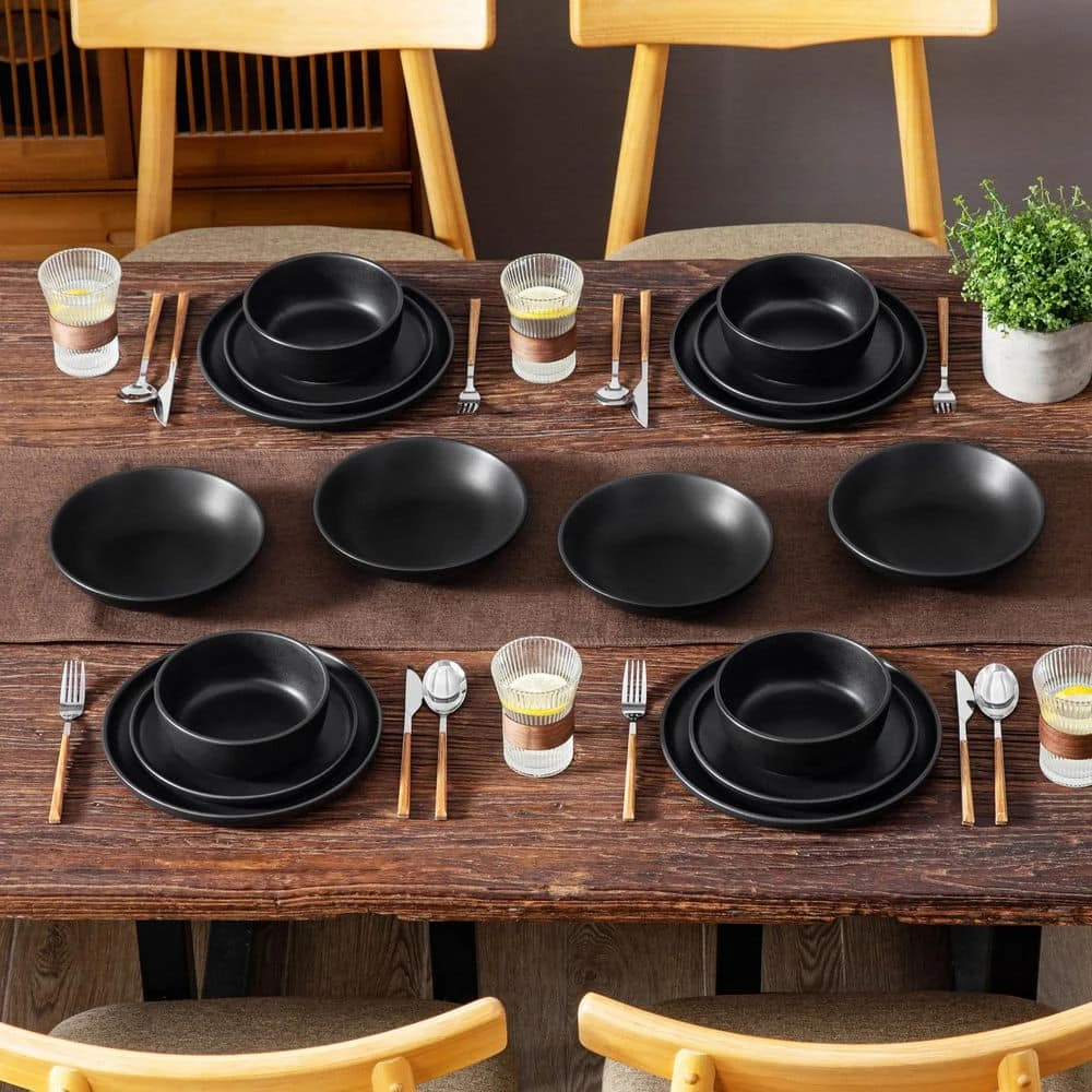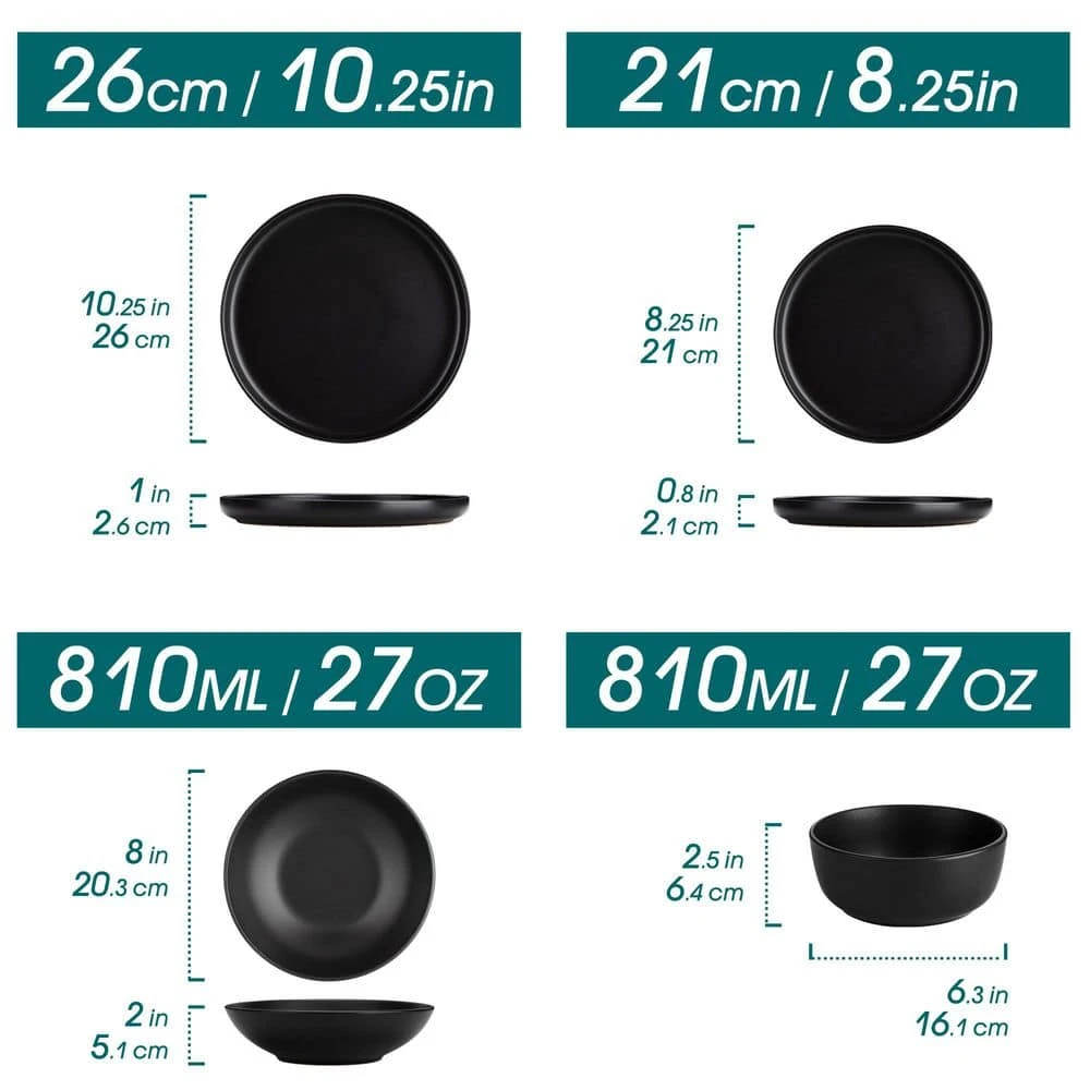 Versatile dining set for 4 people. The 16-piece matte black bowls and plates set made of high quality stoneware material, non-toxic and harmless. Includes 4 x 10.25 in. dinner plates, 4 x 8.25 in. salad plates, 4 x 8 in. pasta bowls(27 oz. ) and 4 x 6.3 in. cereal bowls(27 oz.). Whether formal or casual events, this 4 place settings dinner service will definite provide you a unforgatable dinning experience.