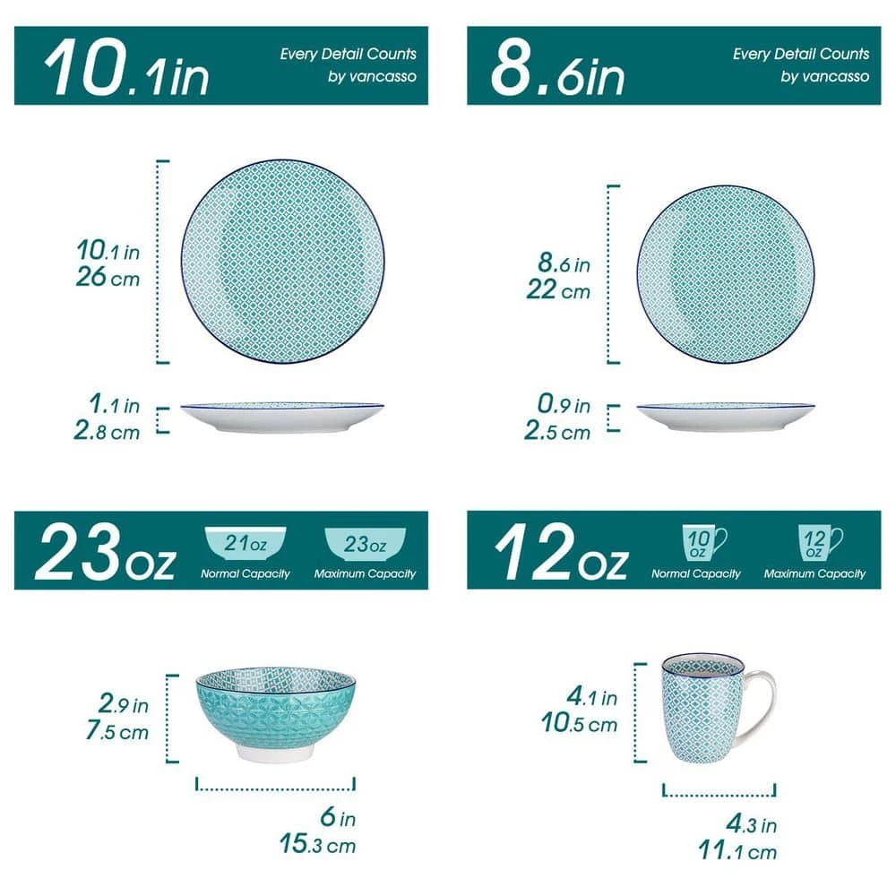 - 16-piece bowls and plates dinner set includes 4 x 10.1 in. dinner plates, 4 x 8.6 in. side plates, 4 x 6 in. / 23 oz. bowls and 4 x 12 oz. mugs, the plates and bowls feel strong but not too thick, the tea cups can stay hot for a long time, either as an every day set or as a wedding gift or special present
