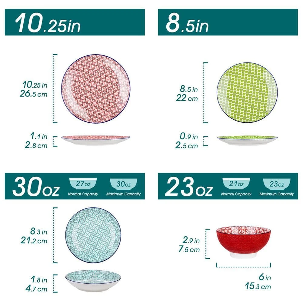 - 16-piece bowls and plates dinner set includes 4 x 10.25 in. dinner plates, 4 x 8.5 in. side plates, 4 x 8.3 in. / 30 oz. pasta bowls and 4 x 6 in. / 23 oz. bowls, the plates and bowls feel strong but not too thick, the tea cups can stay hot for a long time, either as an every day set or as a wedding gift or special present