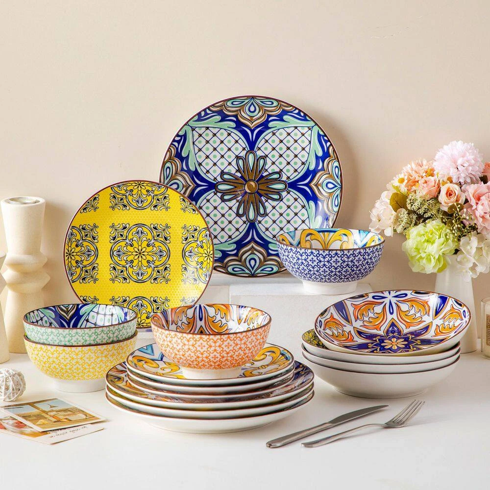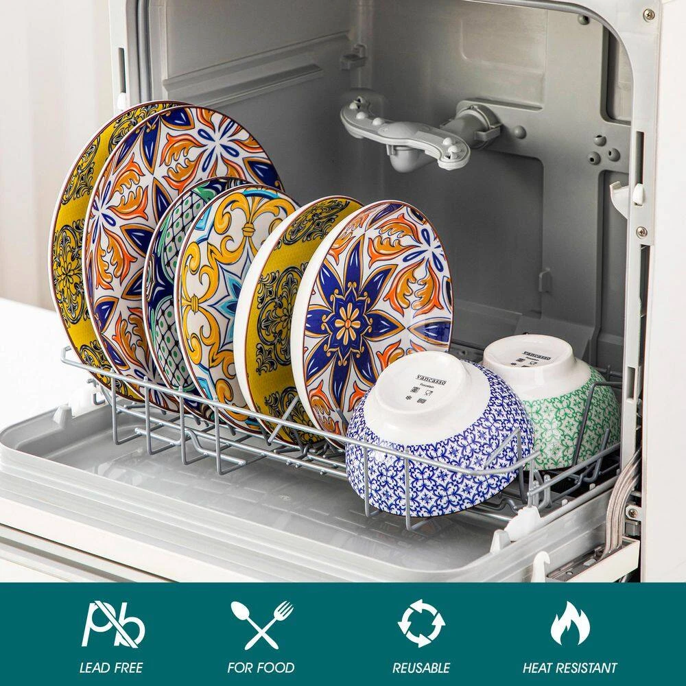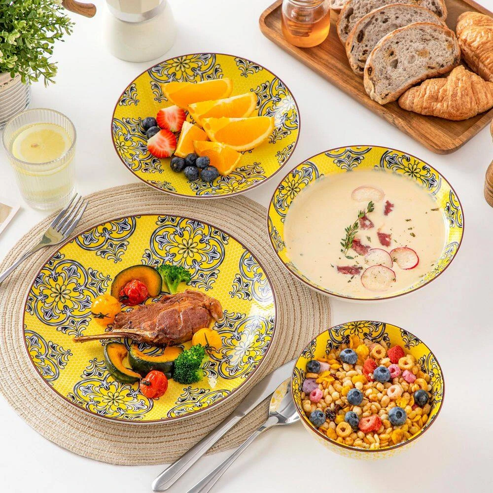 - Crafted from lead and cadmium-free healthy porcelain, non-toxic and eco-friendly, the porcelain has a high level of mechanical resistance, low porosity and high density, will no any chemical reaction with the food, and won’t transfer odors, colors or flavors between uses, this dinnerware sets are evenly glazed with glossy finish, the surface are very smooth, they will be clean just by rinsing under water, great for home, restaurants and hotel use, ideal for daily use or festival decoration