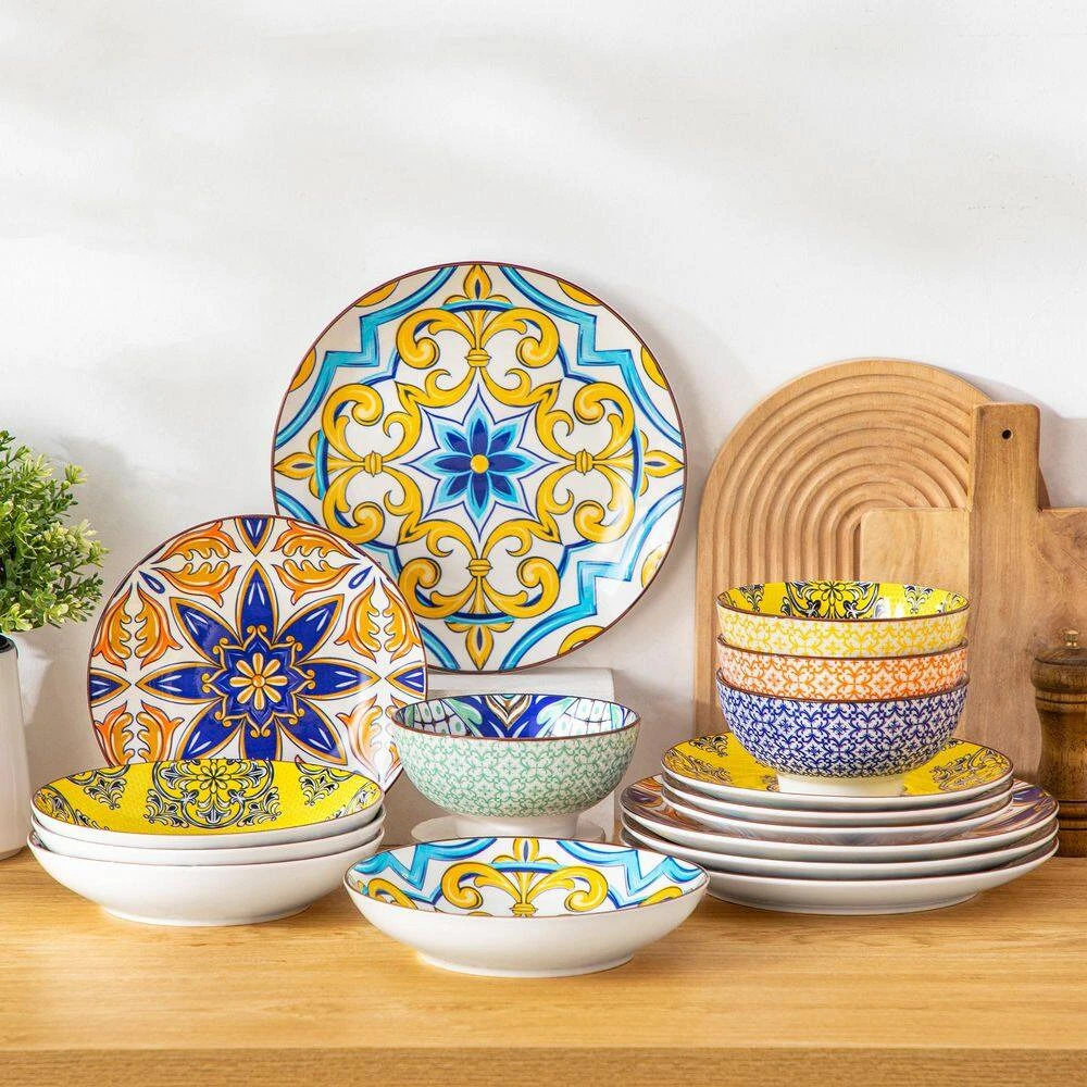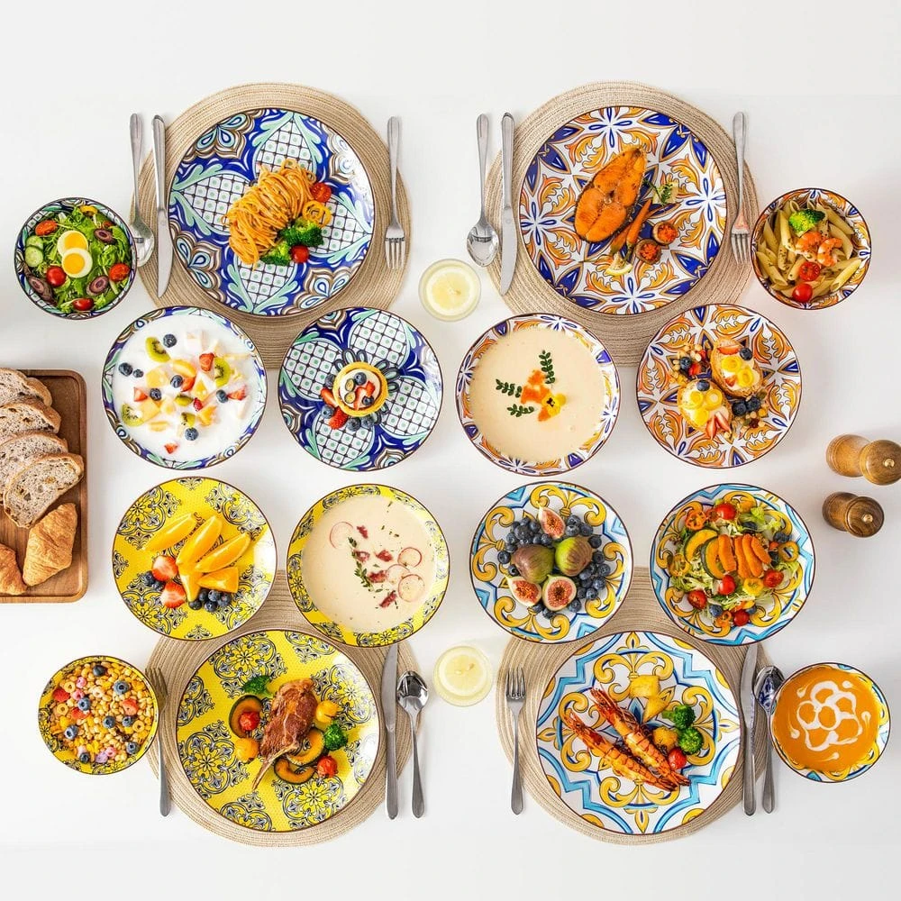 - 16-piece bowls and plates dinner set includes 4 x 10.5 in. dinner plates, 4 x 8 in. dessert plates, 4 x 8.3 in. / 27 oz. pasta bowls and 4 x 6 in. / 21 oz. bowls, perfect for main course, desserts, salad, pasta, soup and rice, this bowls and plates set not only goes perfectly with daily use or at special events but also a great gift for home decor, housewarming, wedding, birthday