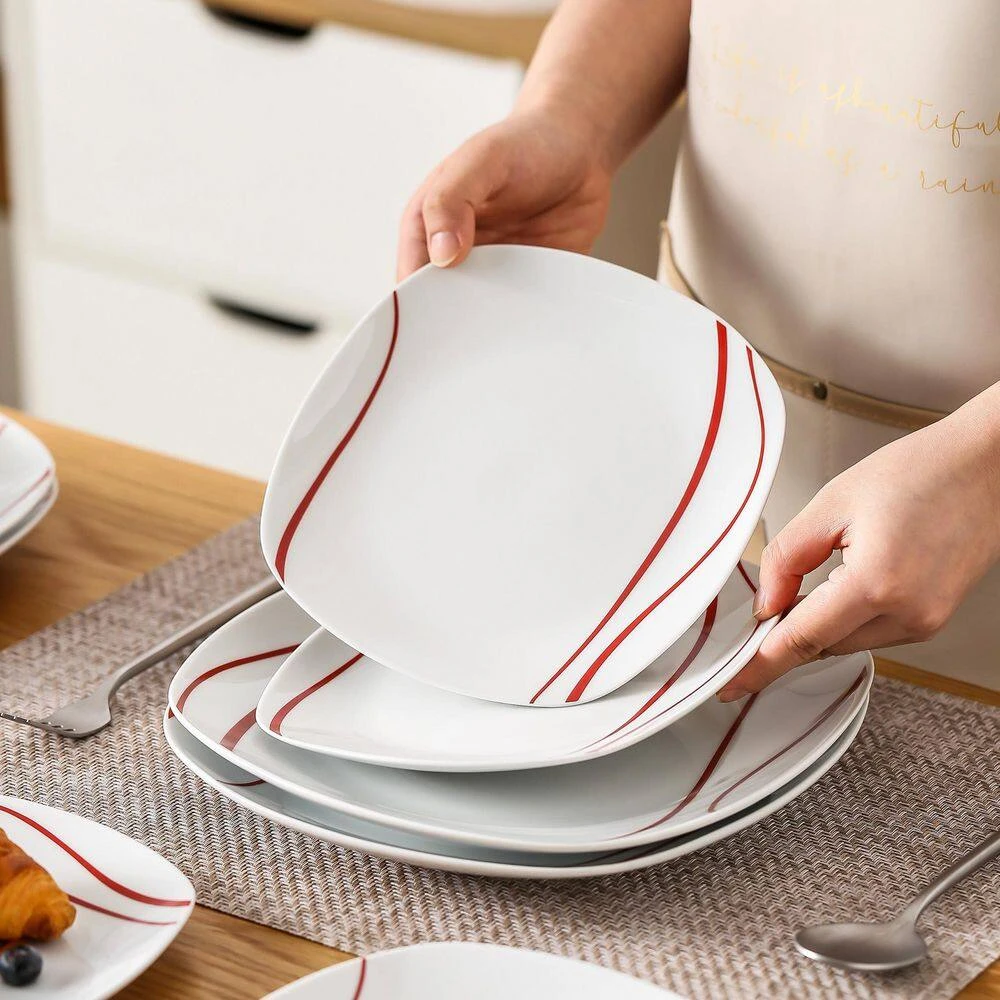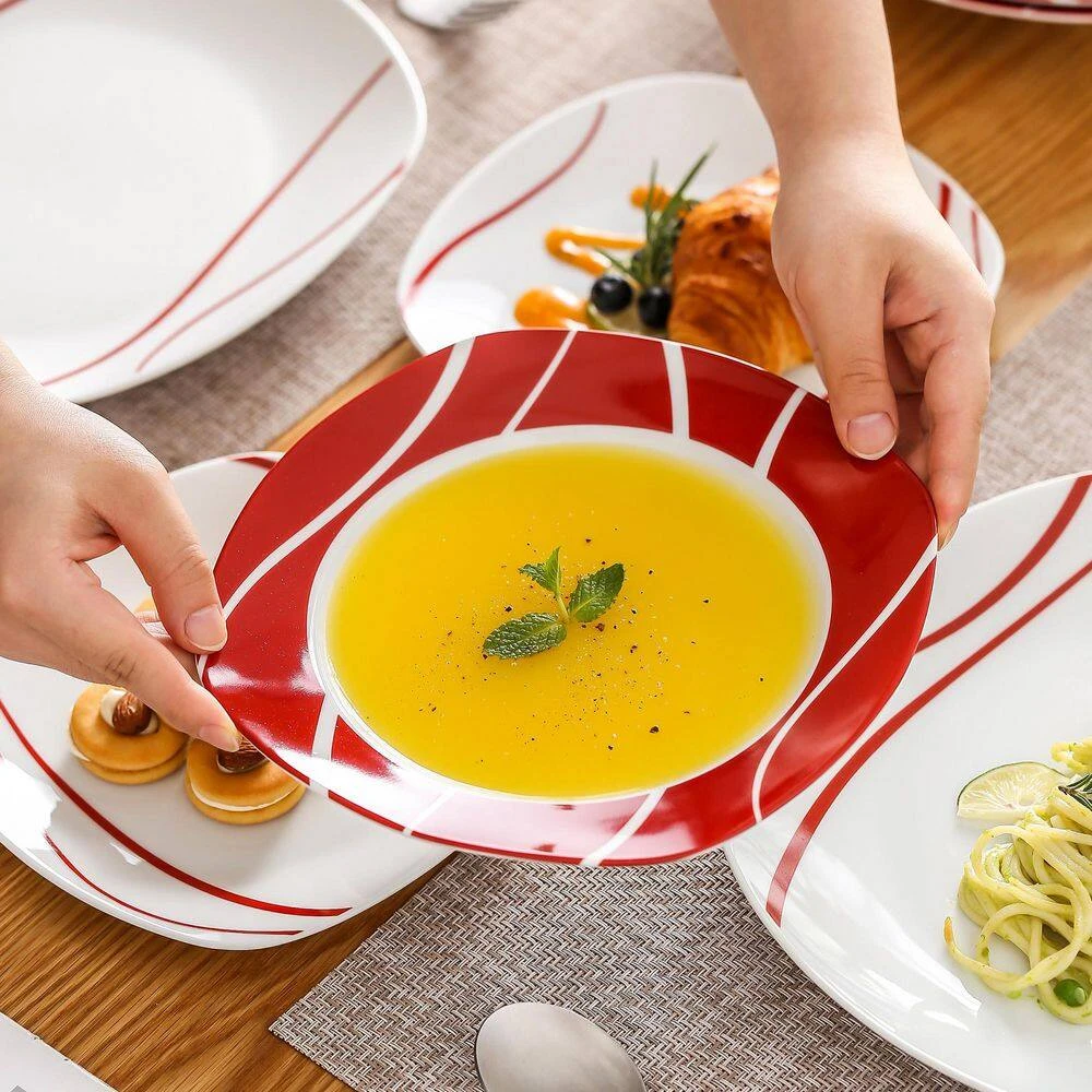- Quality porcelain and minimalist design – made of quality porcelain, non-toxic and harmless, FDA certified lead and cadmium free, made in China, besides, malacasa designers bring the natural elements of the fine into inspiration, red stripes with simple and smooth lines, which could easily matches with existing flatware, beautiful and elegance will be in the kitchen