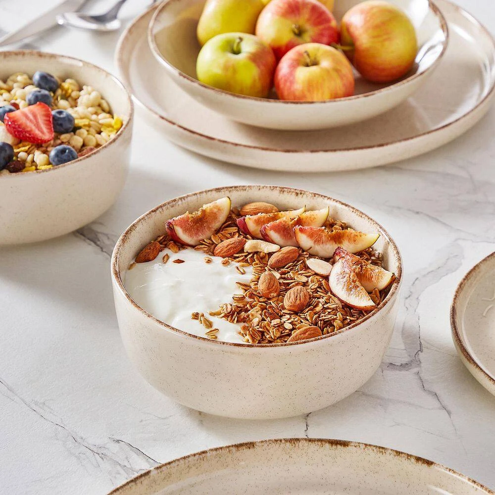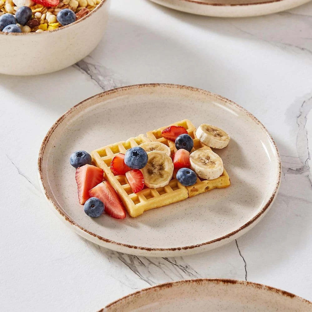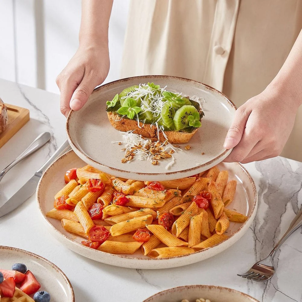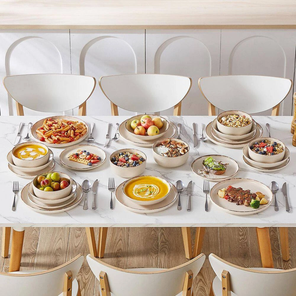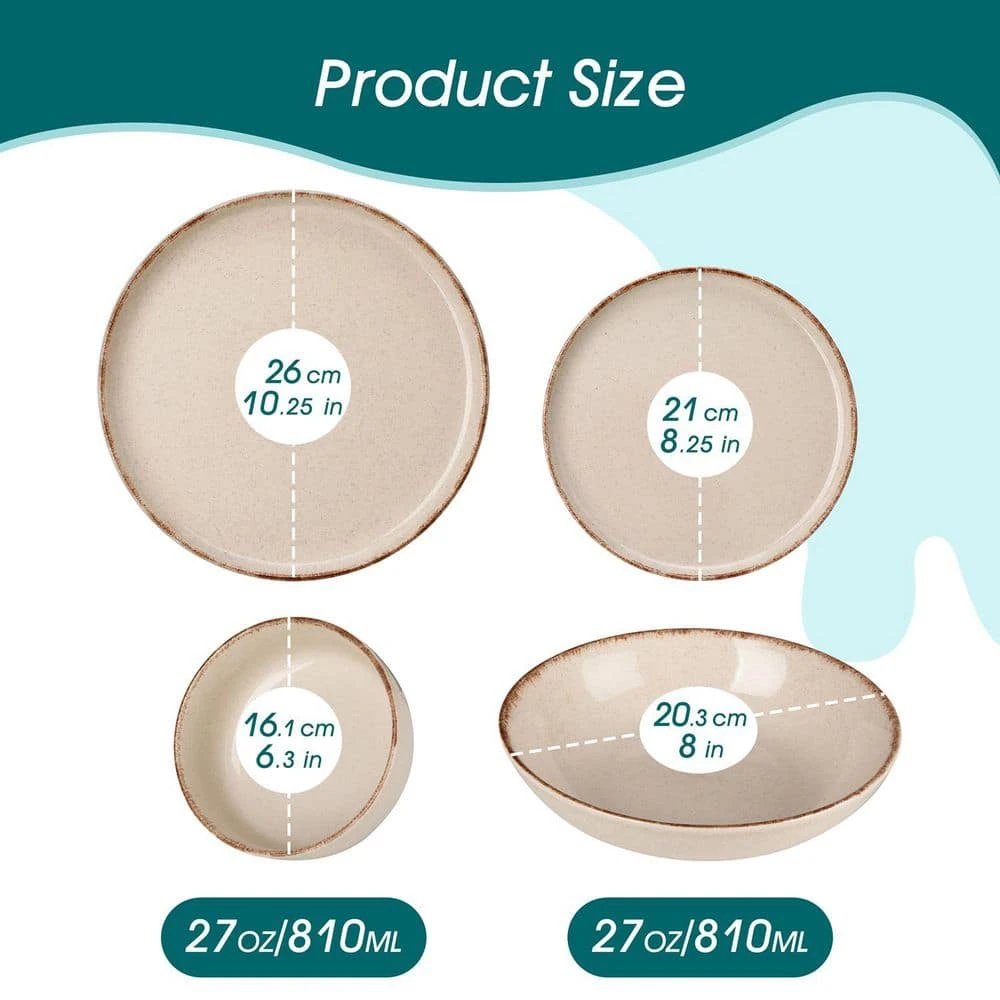 Elevate your dining experience with this 24-piece dinnerware set in beige stoneware, adding a touch of elegance and coziness to your table setting. The rustic beige color and brown edge dinner set, decorated with sesame dots that complements any home decor, allowing for seamless integration with other kitchen and dining items. Each piece in this carefully crafted set combines functionality with aesthetic appeal, making it an excellent choice for everyday use or special occasions.