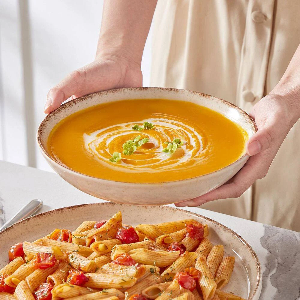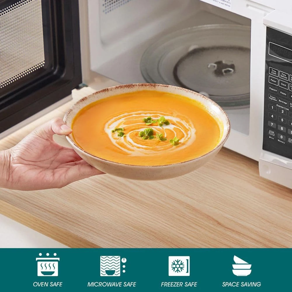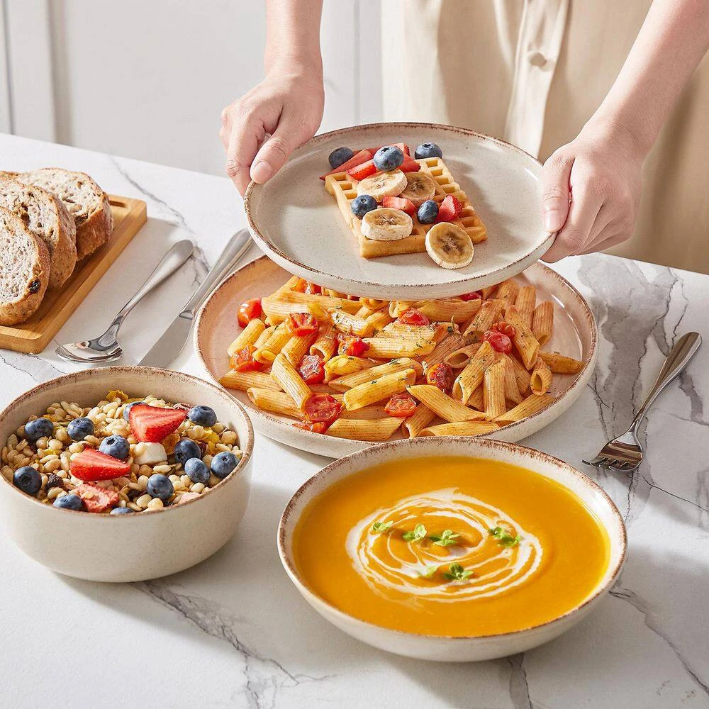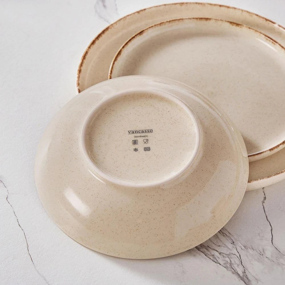 - vancasso 24-piece bowls and plates set are crafted from high-quality stoneware with a fired, glazed, and scratch-resistant finish, nearly-nonstick glazed surface, easy-clean, microwave and dishwasher safe, perfect for those who appreciate durability and rustic style in their dinnerware