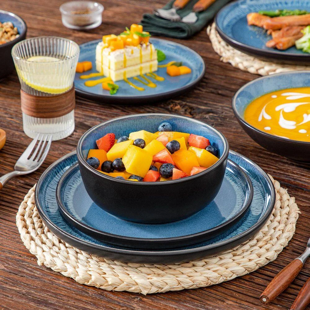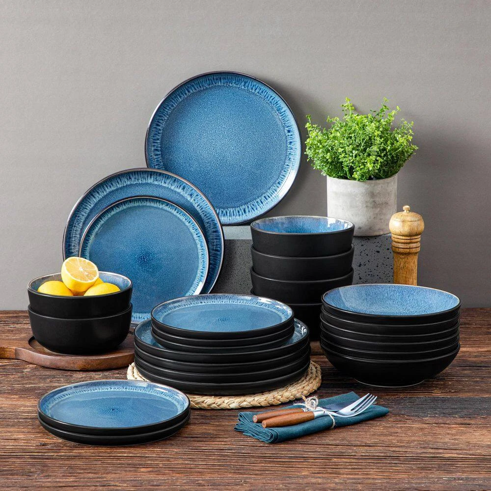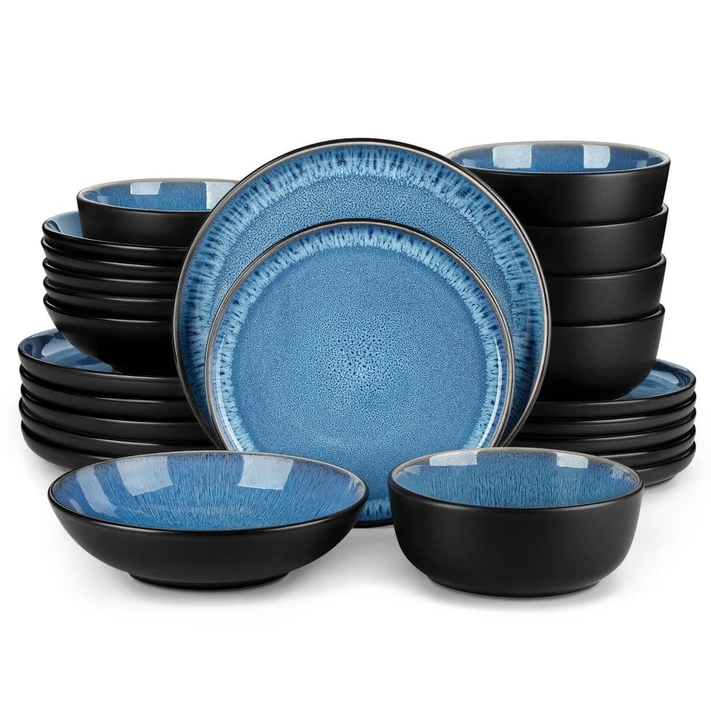 Versatile Dining Set for 6 People – The 24-piece blue and black bowls and plates set made of high quality stoneware material, non-toxic and harmless. Includes 6-piece 10.25 in. dinner plates, 6-piece 8.25 in. salad plates, 6-piece pasta bowls and 6-piece cereal bowls. Whether formal or casual events, this dinner service set (matte black outside, kiln blue inside) for 6 will definite provide you a unforgatable dinning experience.
