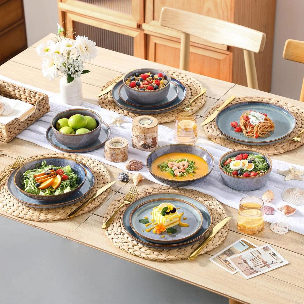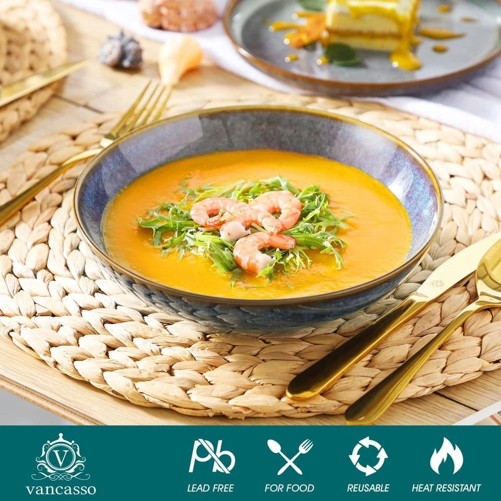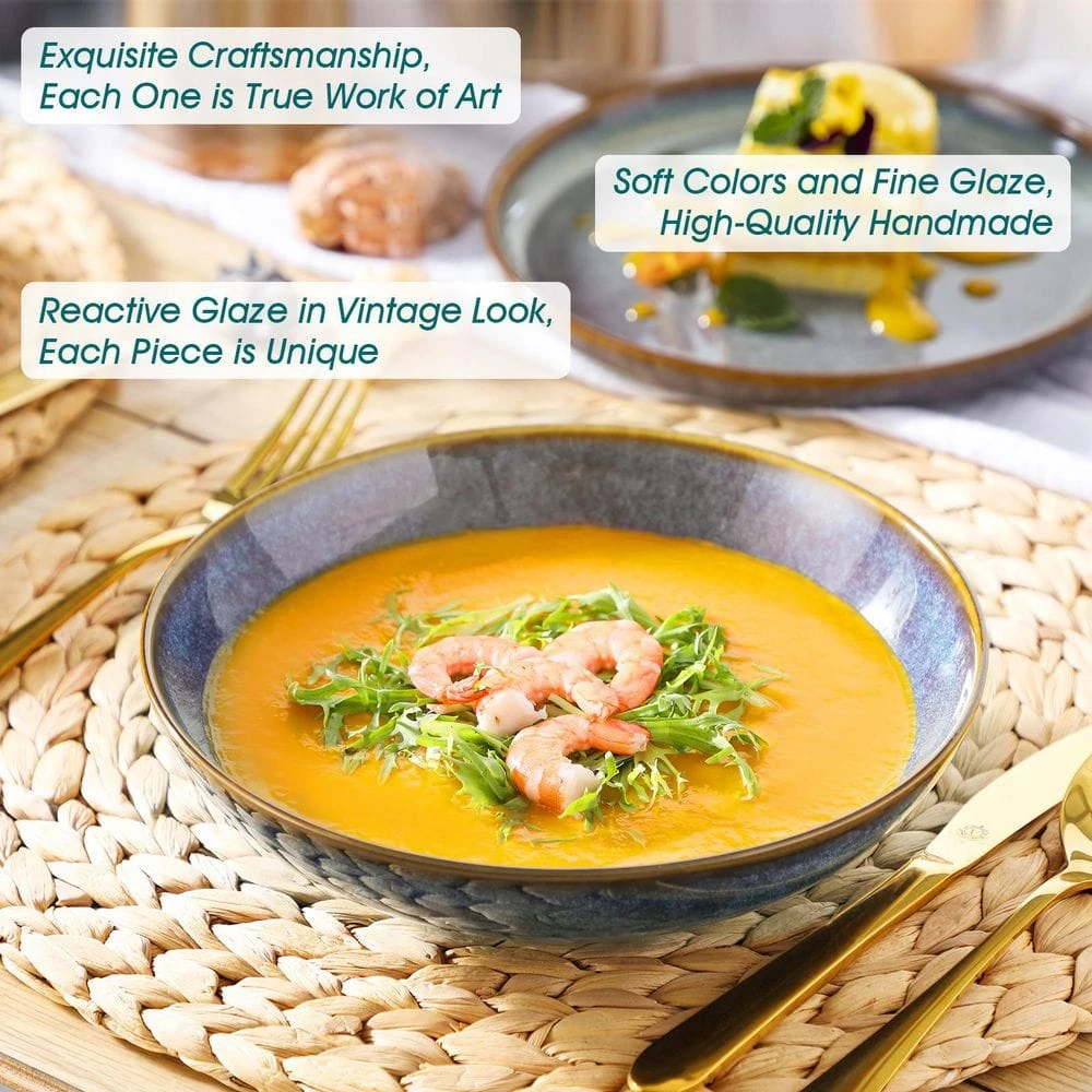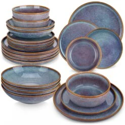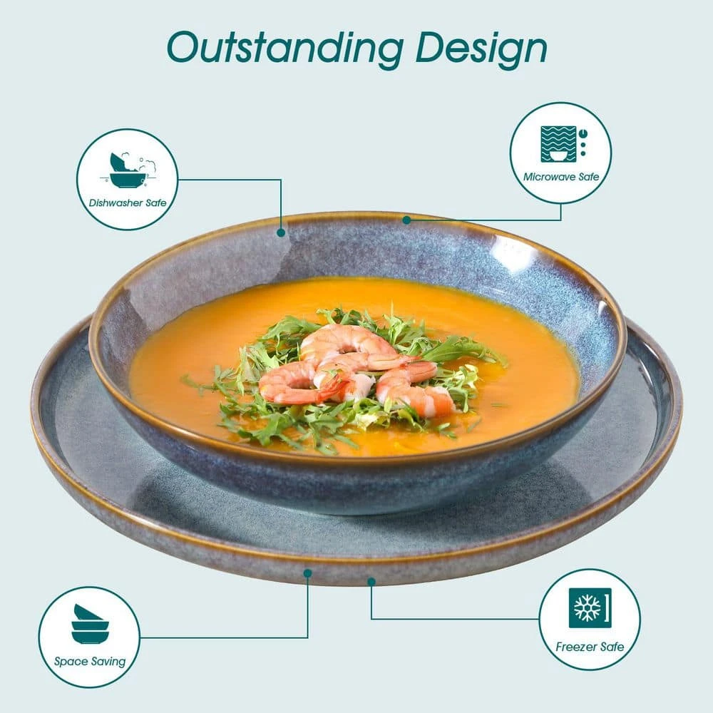 The kiln-changed glaze process makes each piece is unique and the design is unrivalled. You will not find 2-identical pieces in this porcelain collection. The manufacturing process gives them a unique tone. This 24-piece stoneware dinnerware set includes 6 x 10.25 in. dinner plates, 6 x 8.25 in. desserts plates, 6 x 8.25 in. pasta bowl(36 oz.) and 6 x 6.3 in. cereal bowls(30 oz.). Each piece boasts a smooth surface that radiates a captivating shine, creating a warm and inviting atmosphere.