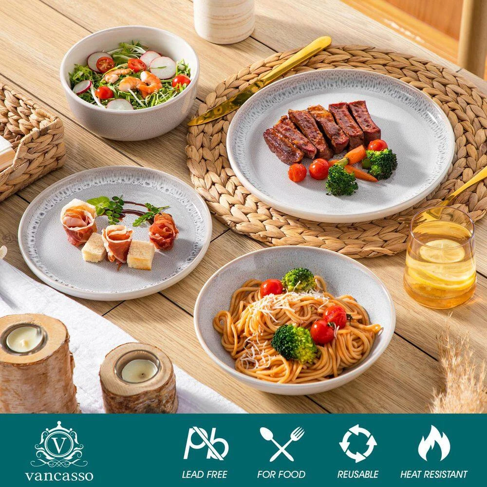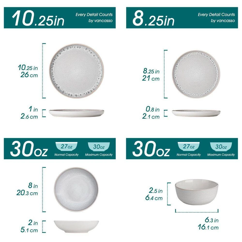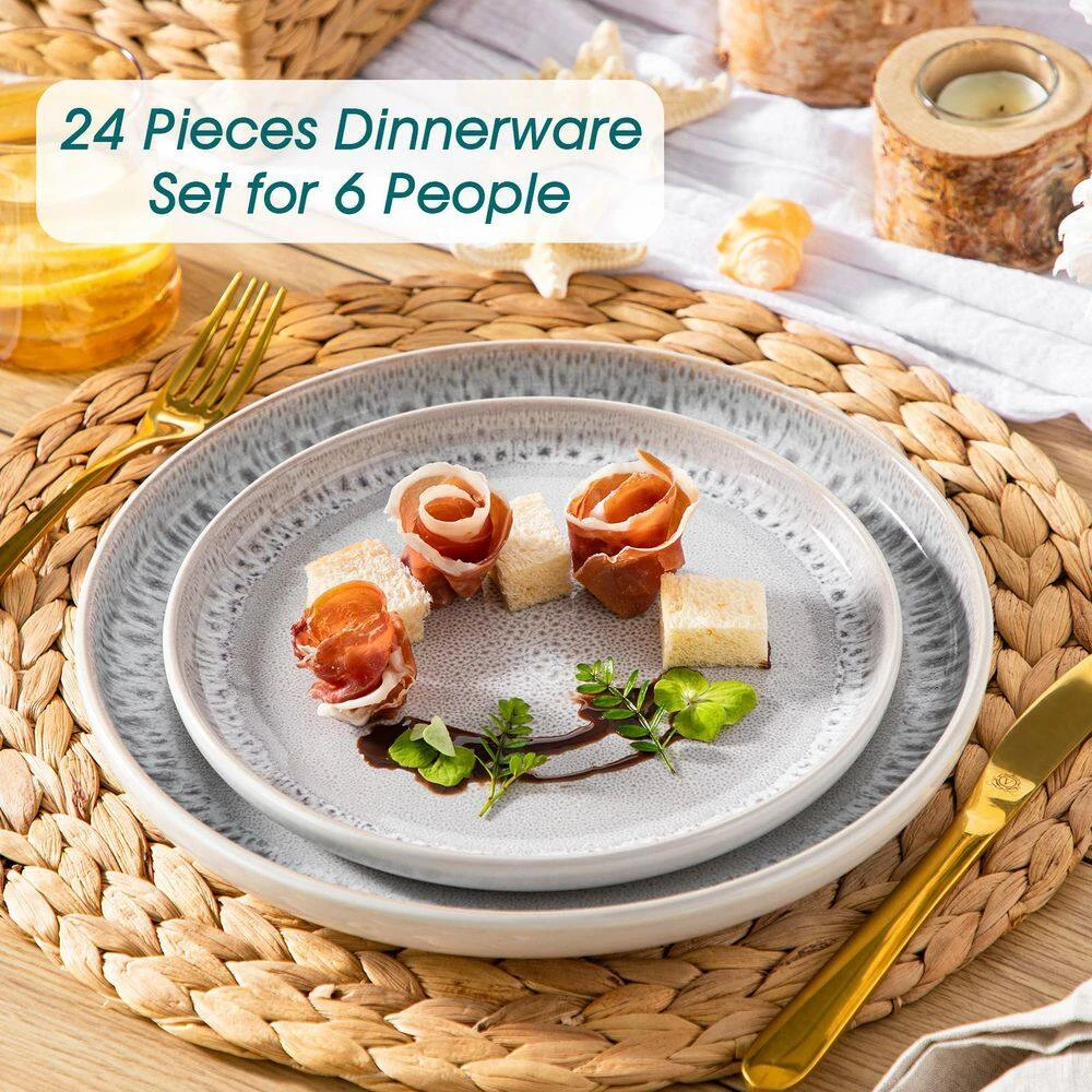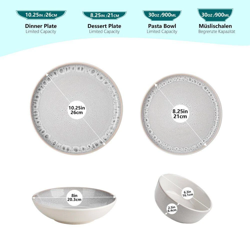 - The 24-piece dinner set service for 6, includes 6 x 10.25 in. dinner plates, 6 x 8.25 in. salad plates, 6 x 8 in. pasta bowl (30 oz.) and 6 x 6.3 in. cereal bowls (30 oz.). This complete collection perfect for steak, salad, soup, rice, pasta, deserts, cereal, fruit, appetizers & entrees