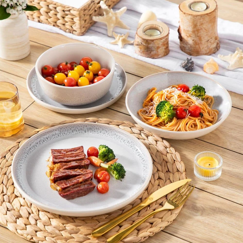 - This bowls and plates dinner set beautifully combines elegance and practicality, bring you ultimatily wonderful dinning experience. Each piece boasts a smooth surface that radiates a captivating shine, creating a warm and inviting atmosphere. The unique snowflake speckle design adds a touch of charm and personality, making every meal feel special