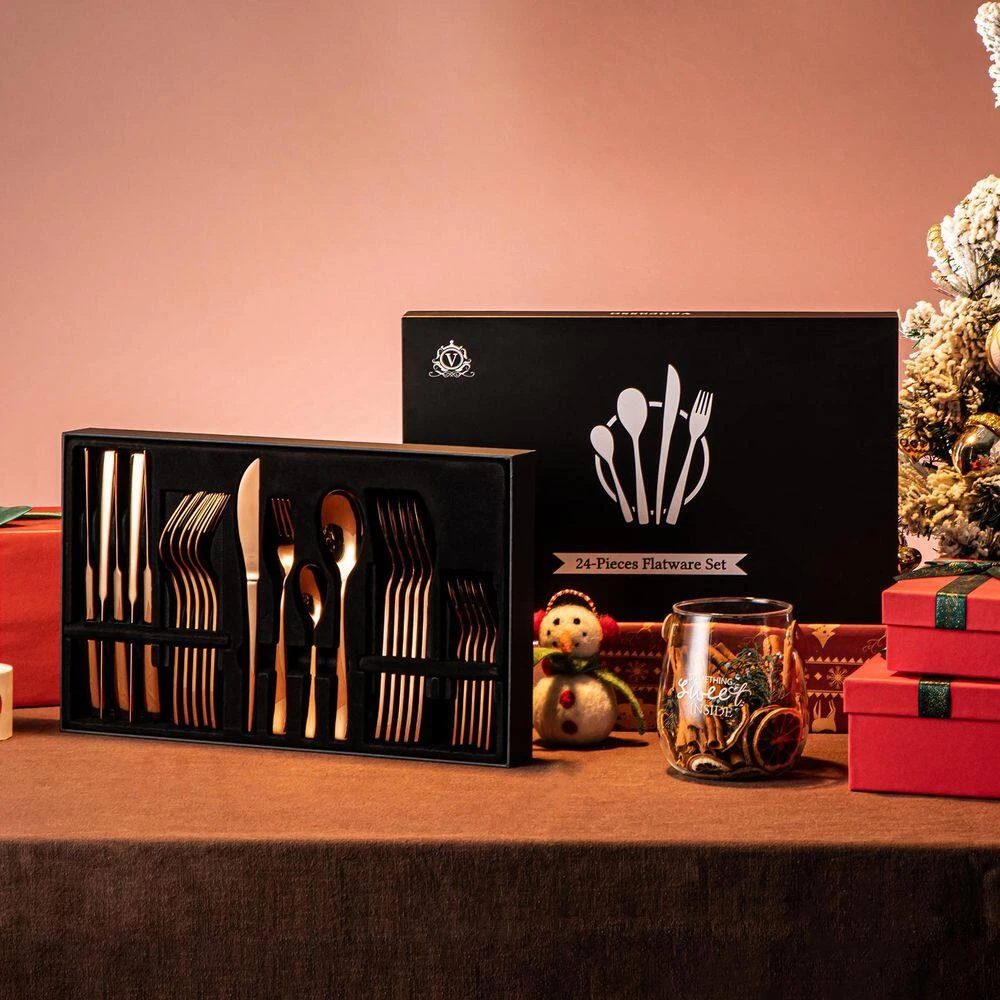 - 24-piece flatware set 6-dinner forks, 6-dinner knives, 6-dinner spoons and 6-teaspoons. Manufactured from high quality stainless steel, impeccable and unbending quality and rounded edges, it is safe to use for both adult and kids. Provide you nice dinner experience, add more fun when have a dinner, exquisite look to impress your family and friends