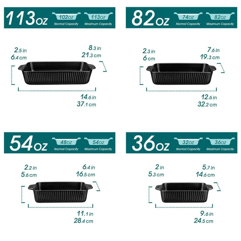 Versatile Multi-size Baking Dish Set – Includes 4 baking dishes of varying sizes – 36 oz., 54 oz., 82 oz., 113 oz. – ideal for preparing a range of dishes from casseroles and roast chicken to lasagna and baked desserts. Crafted from durable stoneware fired at high temperatures, these baking pans are safe for use in both the microwave and oven. The flat bottom ensures even heating and reduces the risk of breakage.