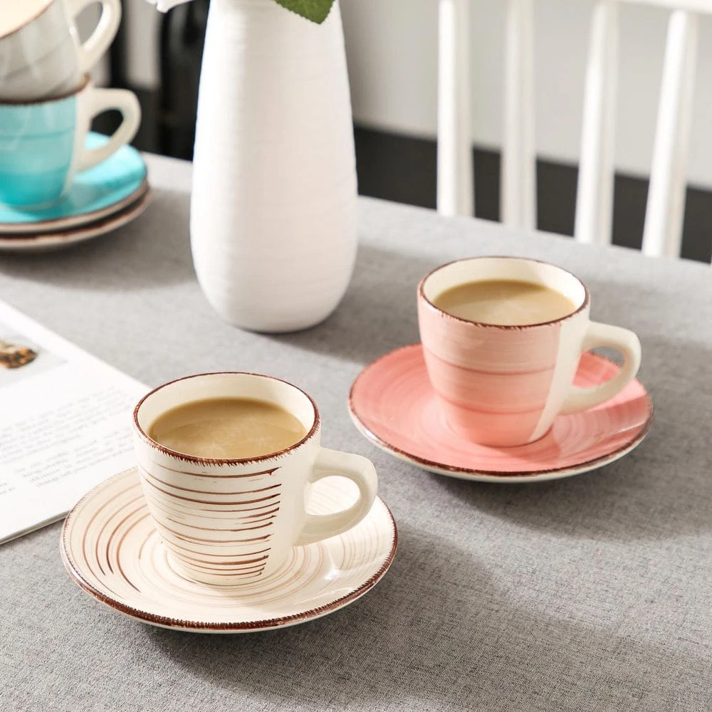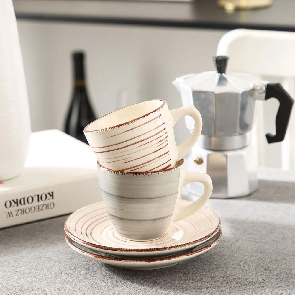 Vancasso bella porcelain coffee cups drinks tea espresso handpainted mugs includes 4 coffee cups and 4 coffee saucers, coffee service set for 4 . Made of fine stoneware material, hand-painted with complex playful line shapes design, special vintage look, in line with any home decoration style. Goes perfectly with family everyday use, and has excellent use at any family get-together, restaurant, formal banquet.