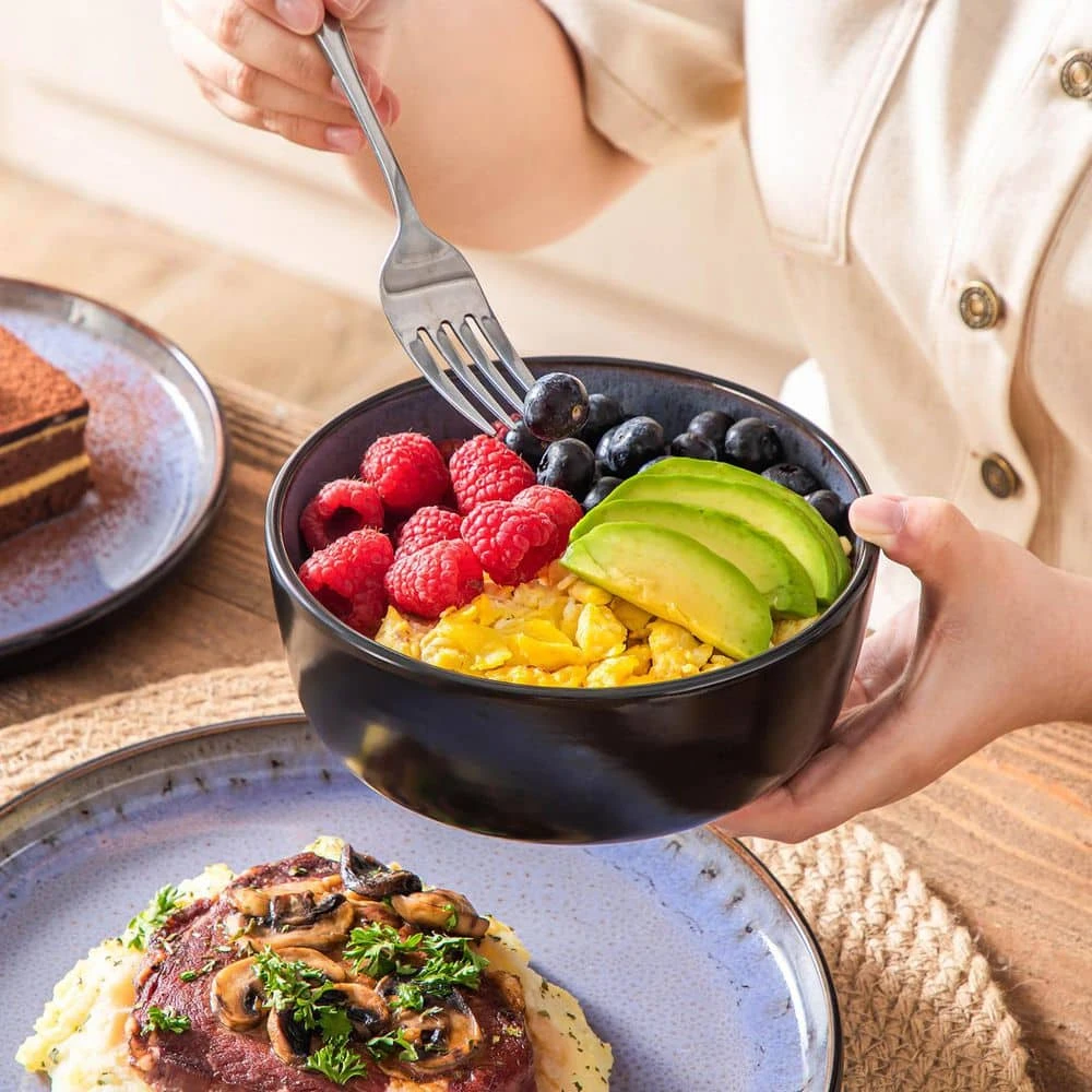 - 【Complete Dinner Set for 4 People】This stoneware plates and bowls set service for 4 people, designed with rounded edges and a practical deep bowl that helps prevent spills, this dinnerware set features a reinforced rim design that makes it chip-resistant, durable for everyday stacking, handling, and long-lasting use in a modern kitchen. 12-piece bowl and plate set includes 4 dinner plates(10.25 in.), 4 dessert plates(8.25 in.) and 4 cereal bowls(6.35 in. / 28 oz.). Ideal for family meals, celebrations, or everyday use, offering both practicality and stunning design for your dining experience