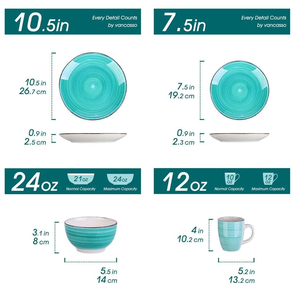 - Packing included – 10.6 in. dinner plate 8.5 in. dessert plate 6 in. bowl and 13 oz. mug