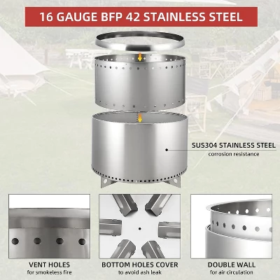 This fire pit features a double-layered design with ventilation, which provides more oxygen during the burning process and accelerates the creation of secondary flames, getting rid of the inconvenience of smoky fires once and for all.